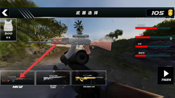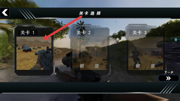 1、進入游戲,可武器選擇界面挑選槍械,選好后進入關(guān)卡選擇,點擊關(guān)卡1就能開啟對應(yīng)的戰(zhàn)斗任務(wù)。