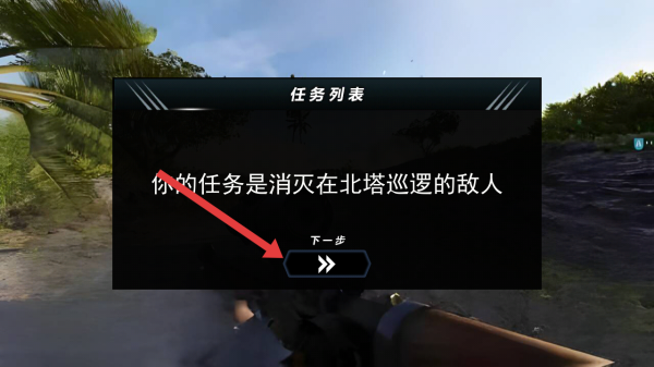 3、進入關(guān)卡1后,會彈出任務(wù)列表,提示任務(wù)是消滅北塔巡邏的敵人,點擊下一步,正式進入戰(zhàn)斗場景。