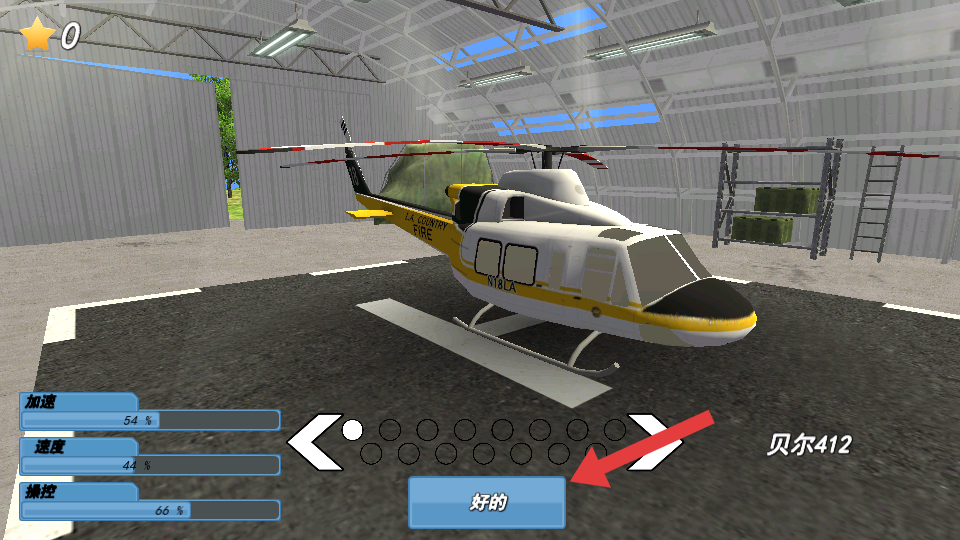 2、進(jìn)入直升機(jī)屬性設(shè)置類界面,可看到加速、速度操控等數(shù)值,還有貝爾412標(biāo)識,確認(rèn)設(shè)置后點(diǎn)擊好的,準(zhǔn)備駕駛直升機(jī)。