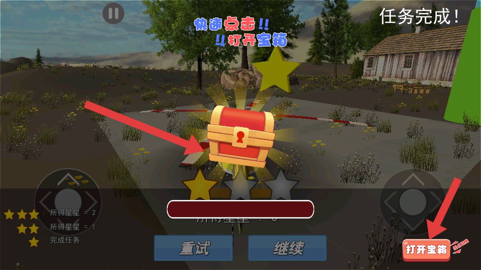4、完成任務(wù)后,界面顯示任務(wù)完成,還有寶箱及快速點(diǎn)擊打開寶箱提示,點(diǎn)擊打開寶箱,可獲取獎勵,也可選擇重試或繼續(xù)。