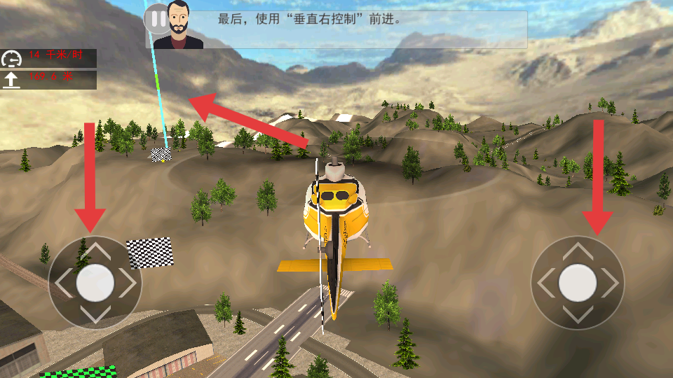 3、駕駛直升機(jī)時,依據(jù)提示最后使用垂直右控制前進(jìn),利用兩側(cè)操控按鈕,控制直升機(jī)朝著目標(biāo)點(diǎn)飛行,注意速度等數(shù)據(jù)變化。