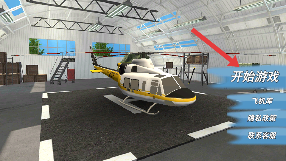 1、游戲初始界面,有停著直升機(jī)的機(jī)庫場景,右側(cè)有開始游戲等選項(xiàng),點(diǎn)擊開始游戲,即可進(jìn)入直升機(jī)駕駛相關(guān)的游戲環(huán)節(jié)。