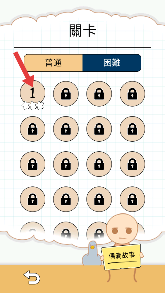2、進(jìn)入關(guān)卡選擇界面,有普通和困難難度,初始僅普通下的關(guān)卡1可玩,點(diǎn)擊該關(guān)卡,開始首場游戲挑戰(zhàn)。