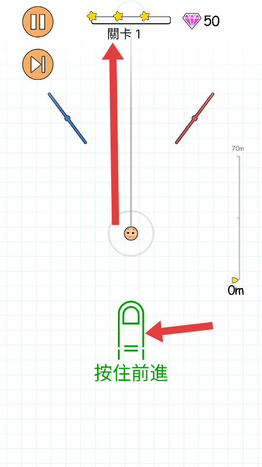 3、關(guān)卡1界面顯示需讓角色向上移動(dòng),下方有按住前進(jìn)按鈕,按住該按鈕,操控角色避開兩側(cè)障礙,向目標(biāo)方向前進(jìn)。