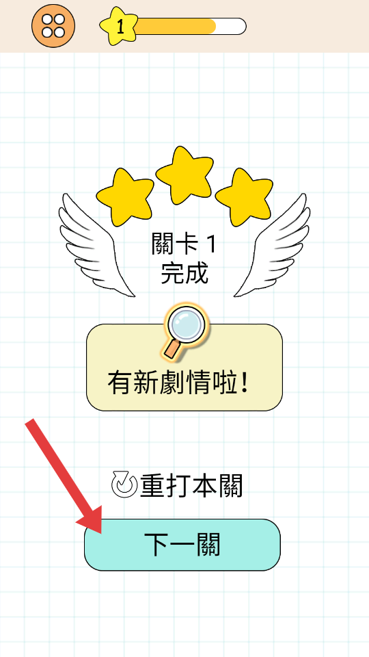 4、成功完成任務(wù)后,會(huì)顯示三星評(píng)價(jià)及有新劇情啦提示,若想繼續(xù)游戲,點(diǎn)擊下一關(guān)挑戰(zhàn)后續(xù)關(guān)卡,解鎖更多內(nèi)容。