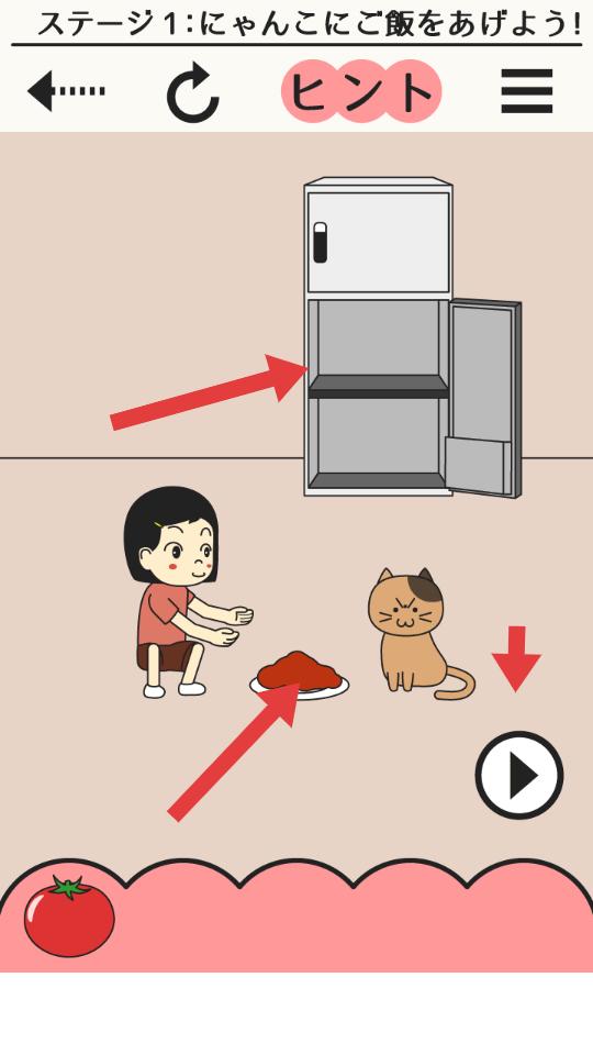 3、到了給貓咪喂食的階段,界面的文字提示,可從冰箱等地方獲取食物,準備好后點擊右下角播放按鈕推進。