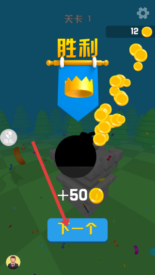 3、成功擊敗敵人后,會出現(xiàn)勝利界面,顯示金幣獎勵,點(diǎn)擊下一個按鈕,可進(jìn)入下一個關(guān)卡繼續(xù)挑戰(zhàn)。