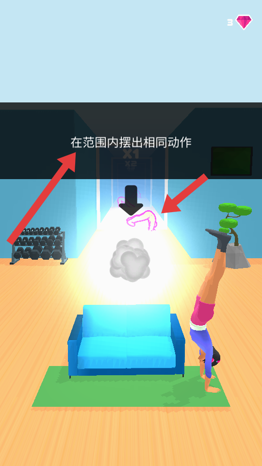 3、當(dāng)出現(xiàn)動(dòng)作提示時(shí),需在指定范圍內(nèi),讓人物擺出與提示相同的動(dòng)作,精準(zhǔn)模仿動(dòng)作是通關(guān)的關(guān)鍵步驟之一。