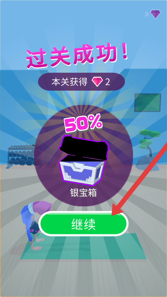 4、成功通關(guān)后,界面會(huì)顯示過(guò)關(guān)成功,本關(guān)獲得2顆鉆石,還有銀寶箱,點(diǎn)擊繼續(xù)按鈕,可進(jìn)入下一關(guān)繼續(xù)挑戰(zhàn)。