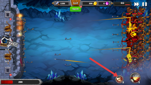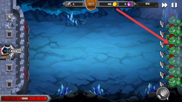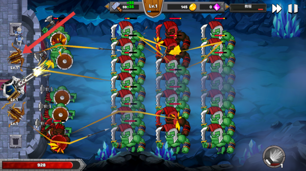 2、戰(zhàn)斗時,操控城堡的弓箭等防御武器,向進攻的綠色怪物發(fā)射攻擊,怪物會不斷靠近,需持續(xù)攻擊阻攔。