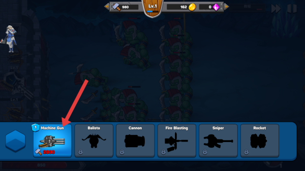 1、進入游戲,能看到城堡面臨綠色怪物進攻的場景,上方顯示等級、金幣等信息,準備利用城堡防御設(shè)施抵御怪物。
