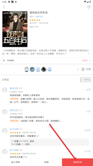 3、進入小說我來自五百年后的詳情頁面,可查看小說評分、簡介等,點擊免費試讀,開始閱讀小說。