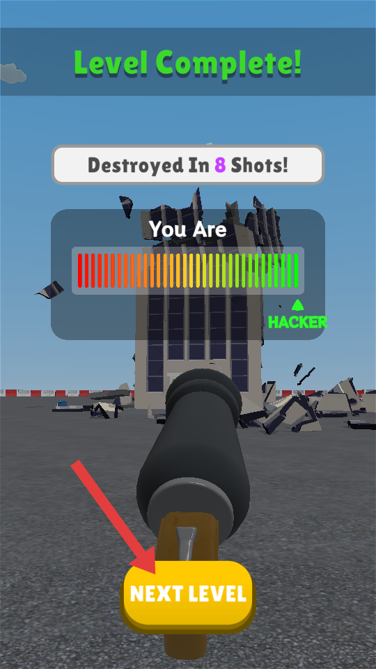 4、成功摧毀大樓后,界面顯示通過本關(guān),提示射擊了八次,點(diǎn)擊下一關(guān)按鈕,繼續(xù)游戲。