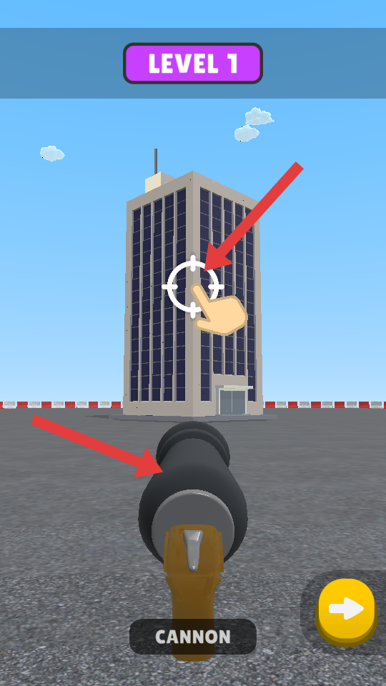 1、在關(guān)卡1,瞄準(zhǔn)前方大樓,點(diǎn)擊屏幕上的瞄準(zhǔn)區(qū)域,操控大炮發(fā)射,開始對大樓進(jìn)行轟擊,開啟摧毀大樓的任務(wù)。