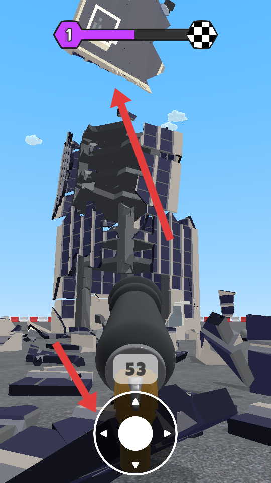 2、持續(xù)發(fā)射炮彈轟擊大樓,利用下方操控區(qū)域調(diào)整大炮角度等,不斷破壞大樓結(jié)構(gòu),觀察上方進(jìn)度條,推進(jìn)摧毀進(jìn)程。