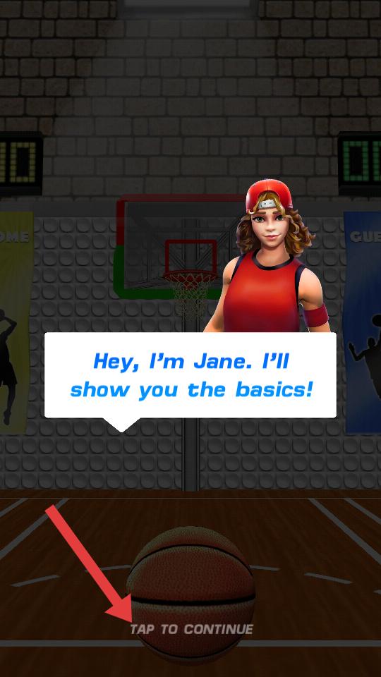 1、進入游戲后,會有角色Jane介紹,提示展示籃球基礎,此時點擊繼續(xù),開啟基礎教學。