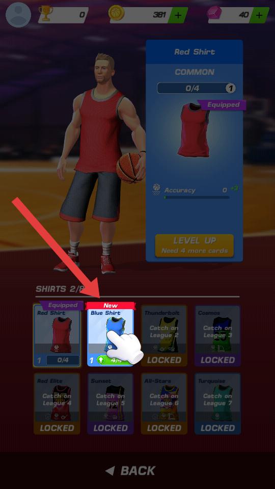 4、完成投籃任務后,可進入服裝界面,能看到不同服裝,如藍色上衣等,可根據(jù)提示點擊新服裝,解鎖或更換角色裝扮,提升游戲體驗。