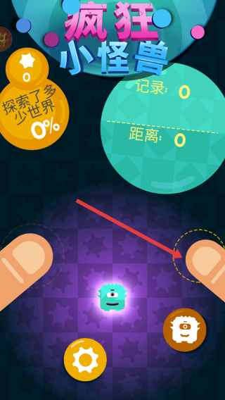 1、進入游戲,看到瘋狂小怪獸的標題界面,顯示探索世界進度等信息,通過操作屏幕兩側,控制小怪獸移動,開啟游戲。