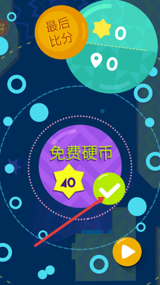 4、游戲結束后,會顯示最后比分等信息,還有免費硬幣40的獎勵提示,點擊綠色對勾按鈕,可領取獎勵,之后可繼續(xù)游戲。