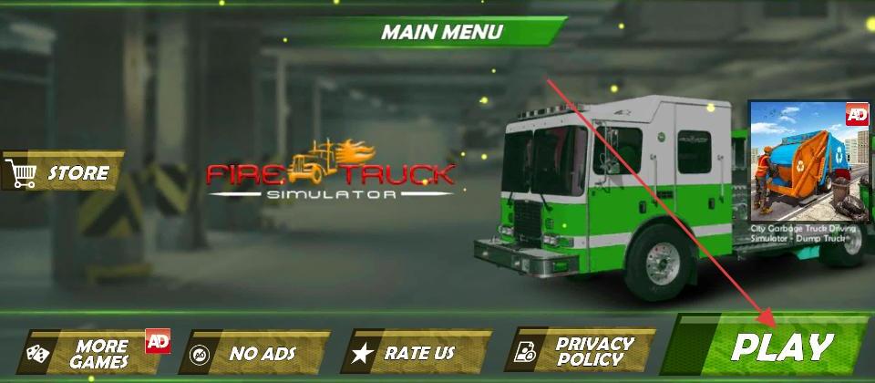 1、進入應(yīng)急消防車救援駕駛模擬器游戲,看到有PLAY按鈕的主菜單界面點擊PLAY按鈕,進入消防車選擇場景,準備挑選消防車開始駕駛。