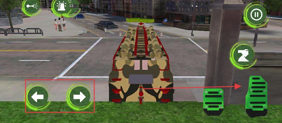 4、登上消防車后利用左側(cè)的左右方向按鈕控制消防車的轉(zhuǎn)向,右側(cè)的踏板按鈕控制消防車的行駛,在城市街道中駕駛消防車,完成消防任務(wù)。