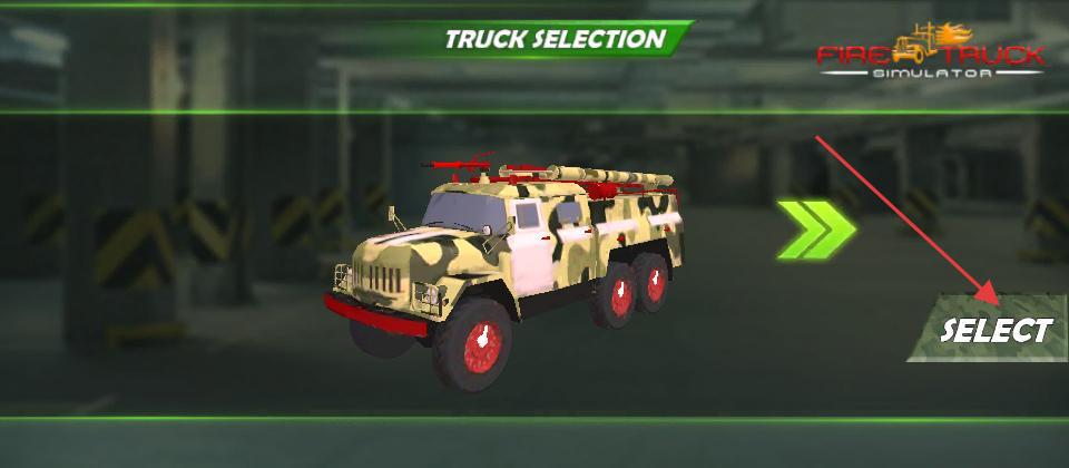 2、在消防車選擇場景中看到展示的消防車,點擊SELECT按鈕,選定該消防車,進入游戲的駕駛準備環(huán)節(jié)。