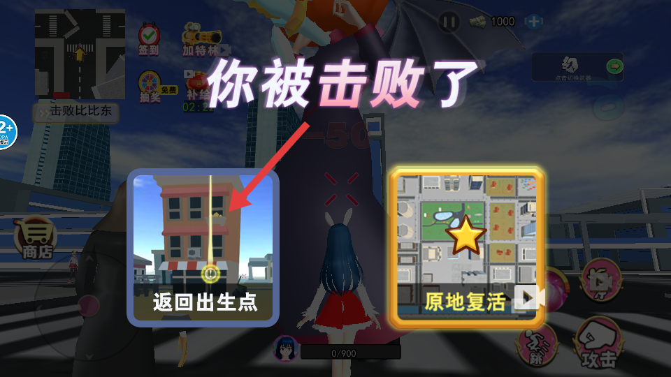 4、若戰(zhàn)斗失敗屏幕會顯示你被擊敗了,此時可選擇返回出生點,回到初始位置重新開始,也可選擇原地復(fù)活繼續(xù)戰(zhàn)斗,根據(jù)情況選擇合適的復(fù)活方式。