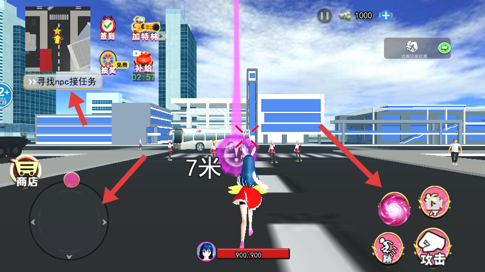 2、進(jìn)入游戲后根據(jù)提示尋找npc接任務(wù),利用左側(cè)虛擬搖桿控制移動,右側(cè)有跳、攻擊等技能按鈕,可在城市場景中移動,尋找npc承接任務(wù)。