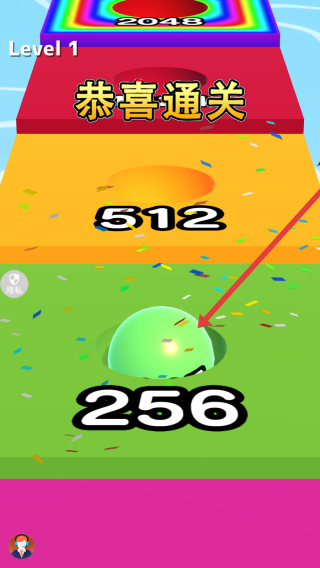 4、當(dāng)小球數(shù)字不斷合并增大,最終達(dá)到通關(guān)要求,會顯示恭喜通關(guān)的界面,小球落入對應(yīng)數(shù)字的平臺,游戲順利結(jié)束。