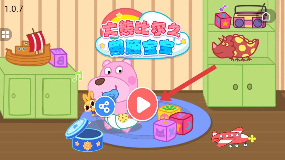 1、進(jìn)入游戲能看到帶有大熊比爾和寶寶元素的界面,還有播放按鈕,點(diǎn)擊該按鈕,即可開啟照顧寶寶的游戲。