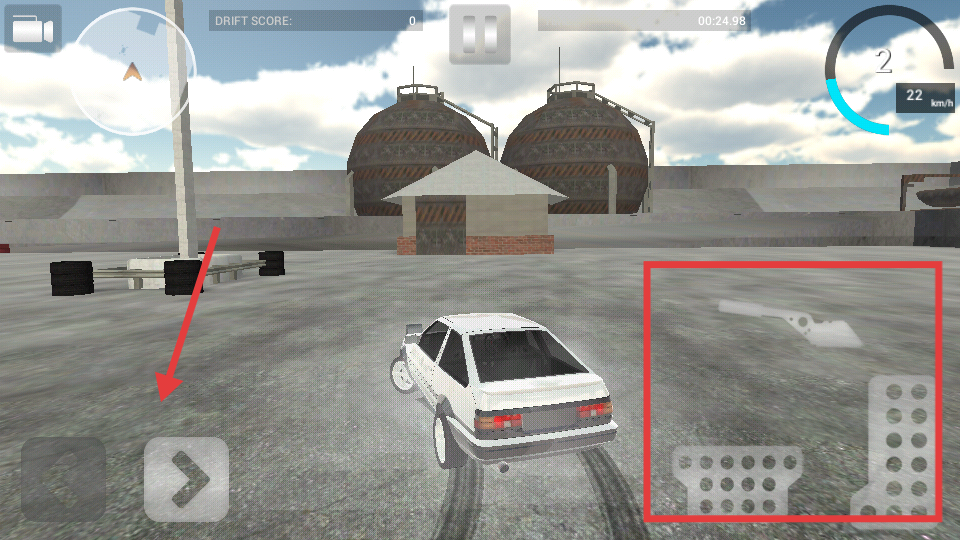 4、駕駛車輛時利用左側(cè)方向按鈕控制方向,右側(cè)油門等按鈕控制車速在賽道上行駛,可以嘗試漂移等操作,獲取漂移分數(shù)提升駕駛技巧。