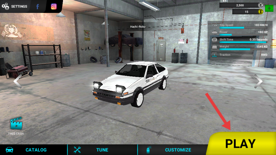 1、進入游戲車庫界面,有一輛可駕駛的汽車,右側(cè)顯示車輛各項性能數(shù)據(jù),點擊PLAY按鈕即可進入游戲,玩家可以開始駕駛挑戰(zhàn)。
