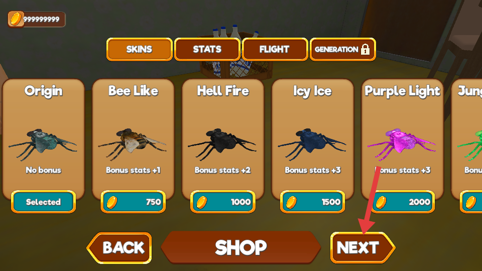 2、進入皮膚選擇界面,有Origin、BeeLike等不同蒼蠅皮膚,可花費金幣解鎖喜歡的皮膚,選好后點擊NEXT,進入下一個界面。