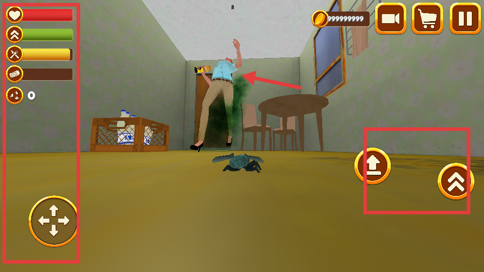 4、游戲過程中左側(cè)有生命、能量等屬性條,右側(cè)有操作按鈕,操控蒼蠅在房間內(nèi)活動,躲避人類的攻擊,同時注意自身屬性變化完成游戲目標。