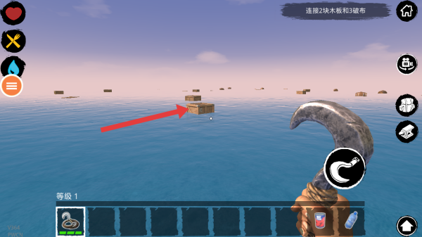 2、接著使用鉤子勾取海上的箱子,從中獲取制作錘子所需的木板、破布等資源,為制作工具做準(zhǔn)備。