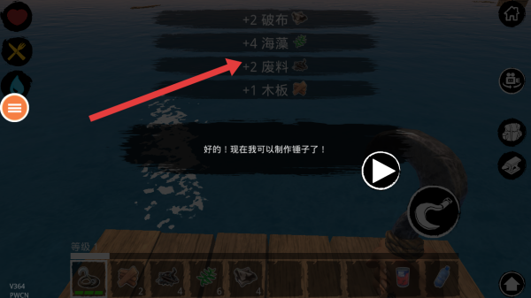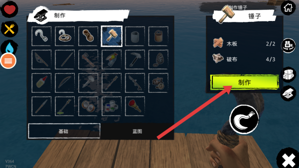 3、成功收集到破布、海藻、廢料、木板等資源后,界面提示可以制作錘子了,進(jìn)入制作環(huán)節(jié)。