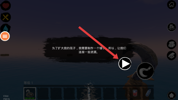 1、游戲開始,界面提示為擴(kuò)大木筏需制作錘子,要先連接資源,點(diǎn)擊播放按鈕,開啟收集資源的流程。
