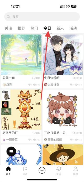 4、切換到今日板塊瀏覽公園一角、生日快樂喲等當(dāng)日創(chuàng)作內(nèi)容,了解最新創(chuàng)作動(dòng)態(tài),挑選喜歡的作品進(jìn)行互動(dòng),同時(shí)關(guān)注新人與活動(dòng)板塊,獲取更多創(chuàng)作資訊。