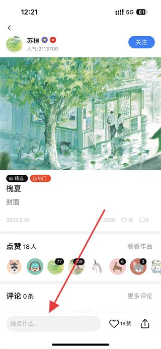 2、在作品詳情頁可點(diǎn)擊評(píng)論框,參與評(píng)論互動(dòng),表達(dá)對(duì)作品的看法,同時(shí)查看點(diǎn)贊人數(shù)與其他用戶的互動(dòng)情況,交流創(chuàng)作見解,豐富參與感。
