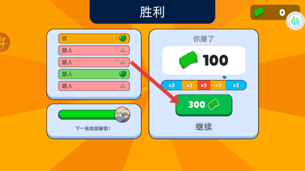 4、成功隱藏未被發(fā)現(xiàn),游戲勝利后會(huì)顯示勝利界面,能獲得相應(yīng)的金錢獎(jiǎng)勵(lì),還可點(diǎn)擊繼續(xù)開(kāi)啟下一輪游戲。