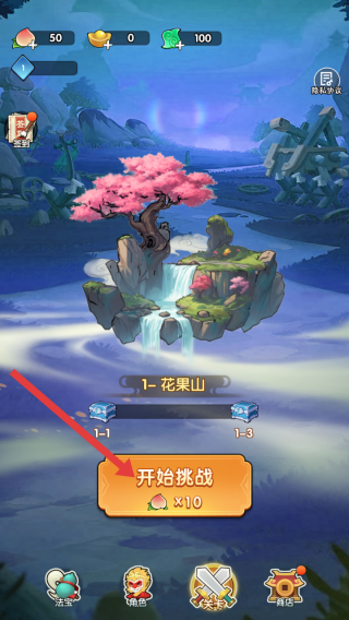 1、進入游戲花果山場景,點擊開始挑戰(zhàn)按鈕,消耗10個桃子,開啟花果山的冒險戰(zhàn)斗。