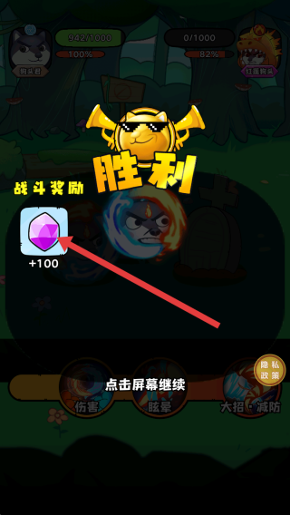 4、成功擊敗敵人后,會顯示勝利界面,獲得戰(zhàn)斗獎勵,如紫色寶石等,點擊屏幕可繼續(xù)后續(xù)游戲。