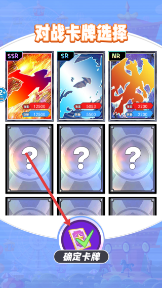 2、進(jìn)入對(duì)戰(zhàn)卡牌選擇界面,從SSR、SR、NR等不同稀有度的卡牌中挑選合適的卡牌,點(diǎn)擊確定卡牌,組成對(duì)戰(zhàn)卡組。