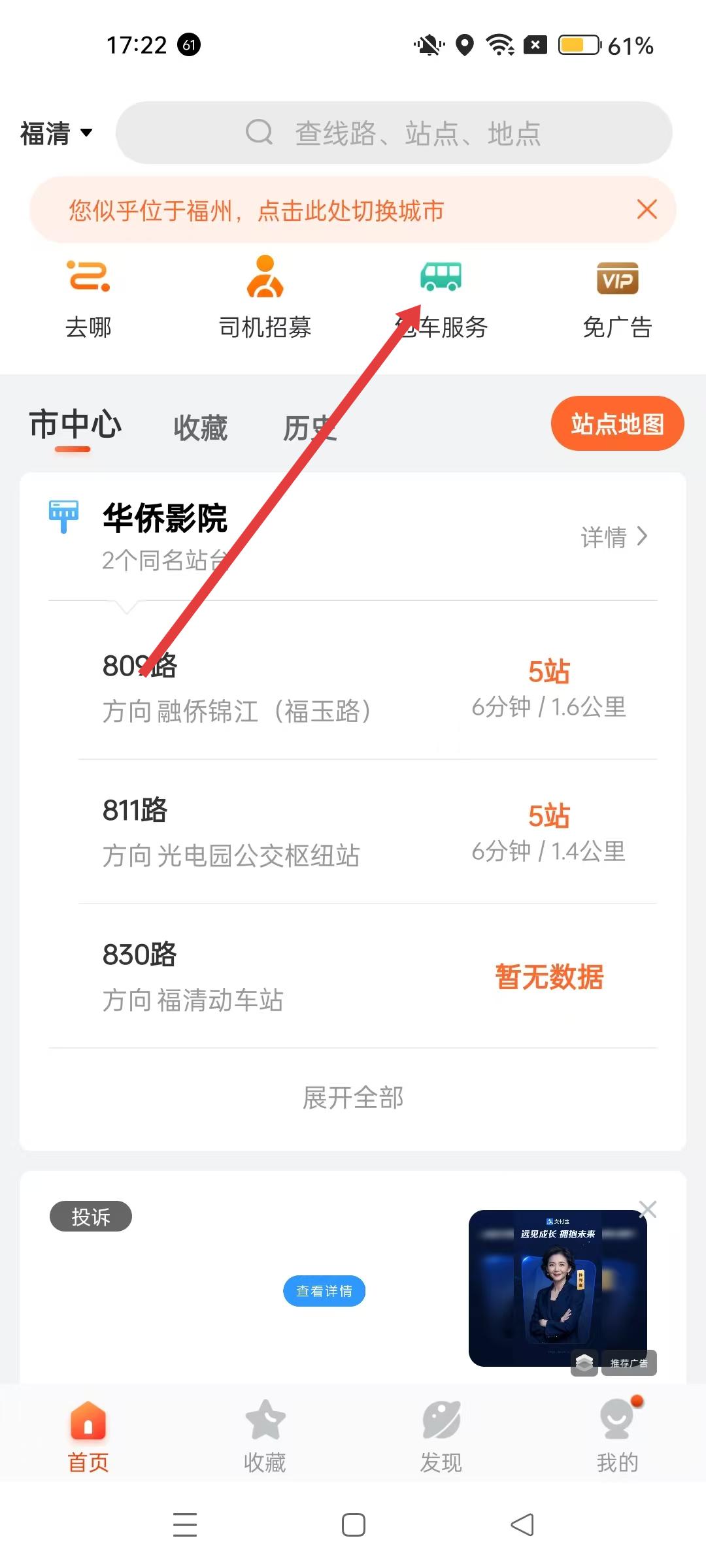 1、進(jìn)入掌上公交首頁,可查看福清地區(qū)公交信息,點擊包車服務(wù)可進(jìn)入包車流程,開啟包車服務(wù)體驗。