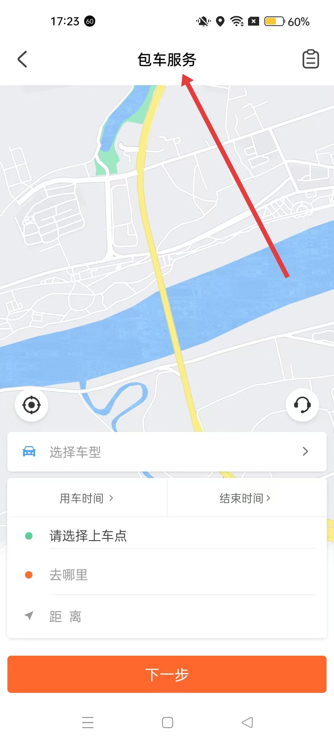 2、包車服務(wù)界面,可看到地圖及車型、用車時間等選擇項,需依次設(shè)置相關(guān)信息,推進(jìn)包車申請。