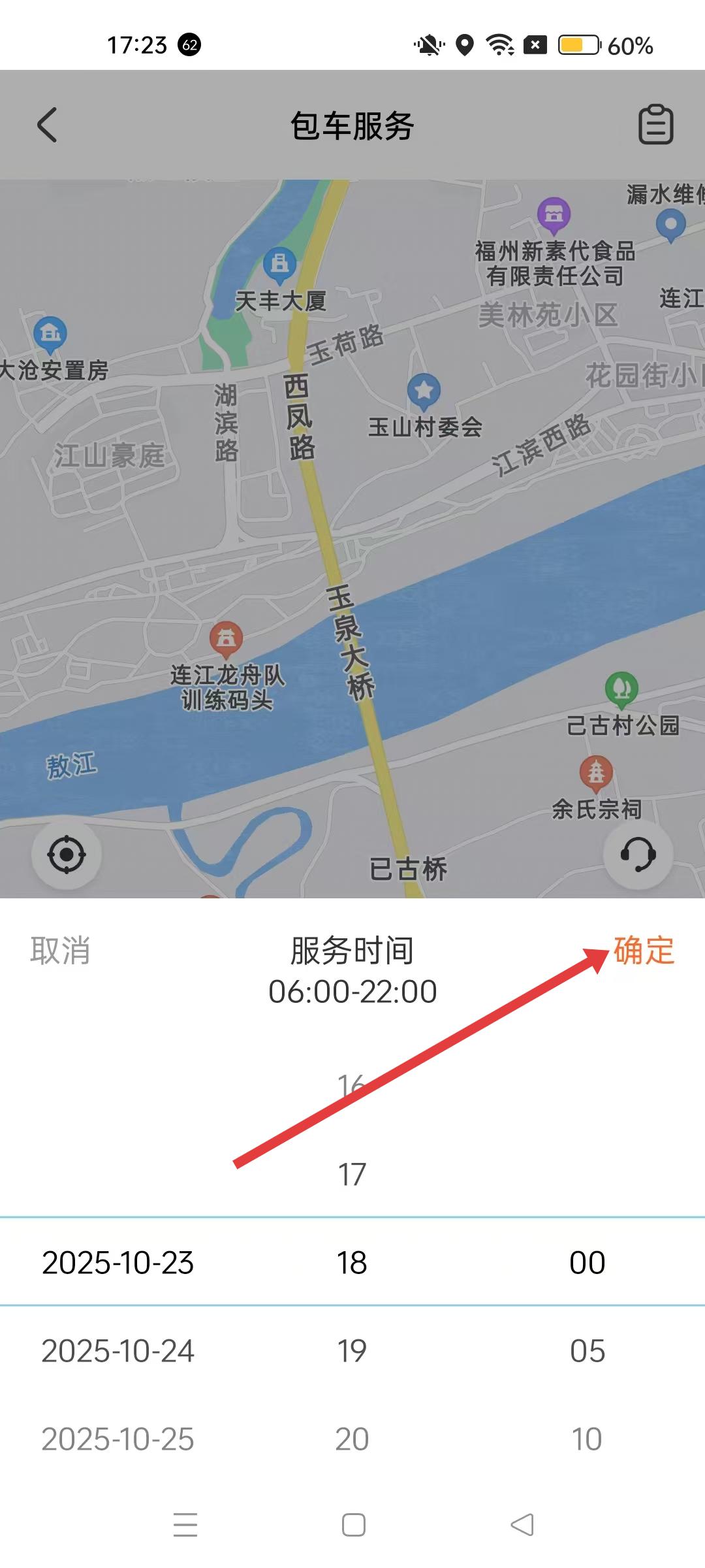 4、選擇用車時間后,確認(rèn)服務(wù)時間范圍,點擊確定完成時間設(shè)置,繼續(xù)后續(xù)包車步驟,以便成功預(yù)約包車服務(wù)。