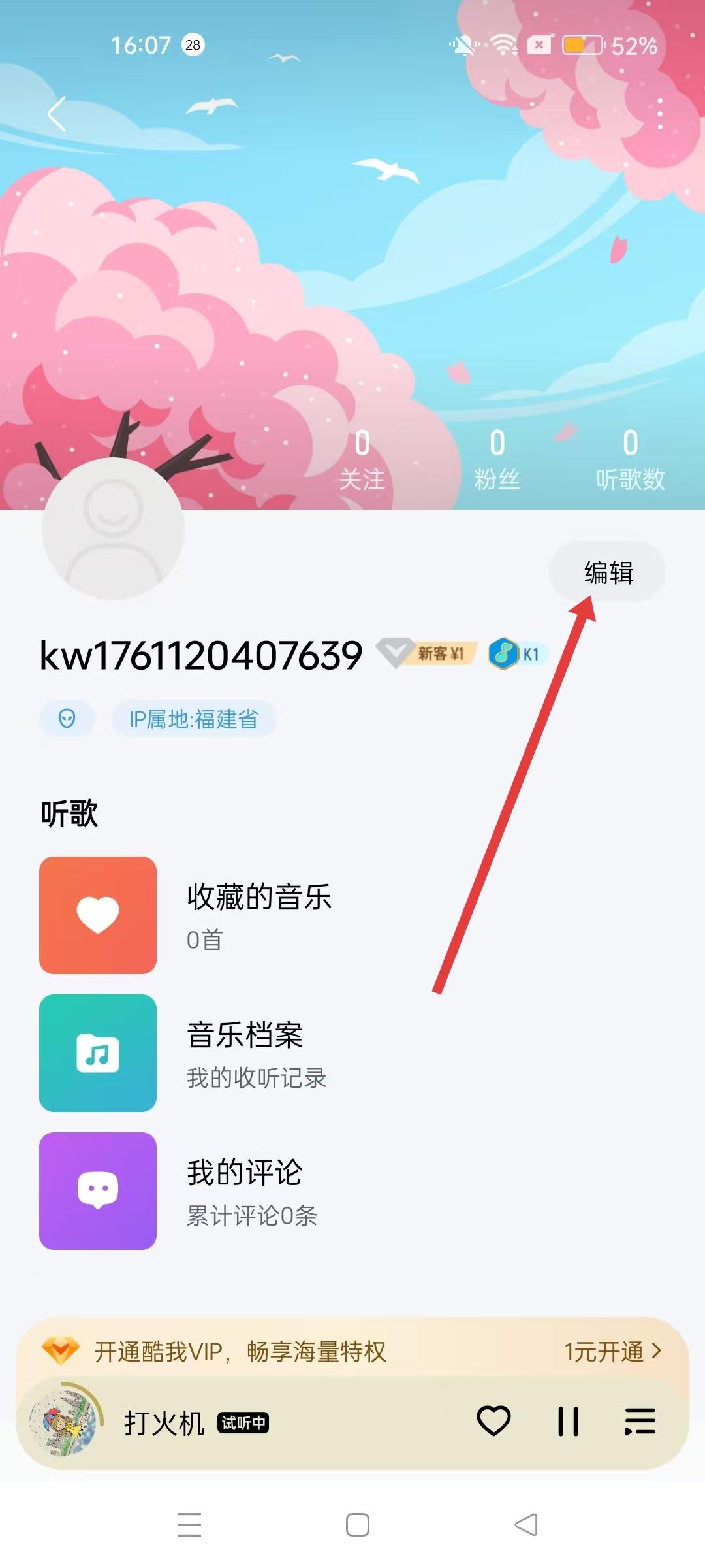4、個(gè)人主頁(yè),可看到IP屬地、聽(tīng)歌相關(guān)數(shù)據(jù)等信息,點(diǎn)擊編輯按鈕,可對(duì)個(gè)人賬號(hào)信息進(jìn)行編輯,完善賬號(hào)資料。