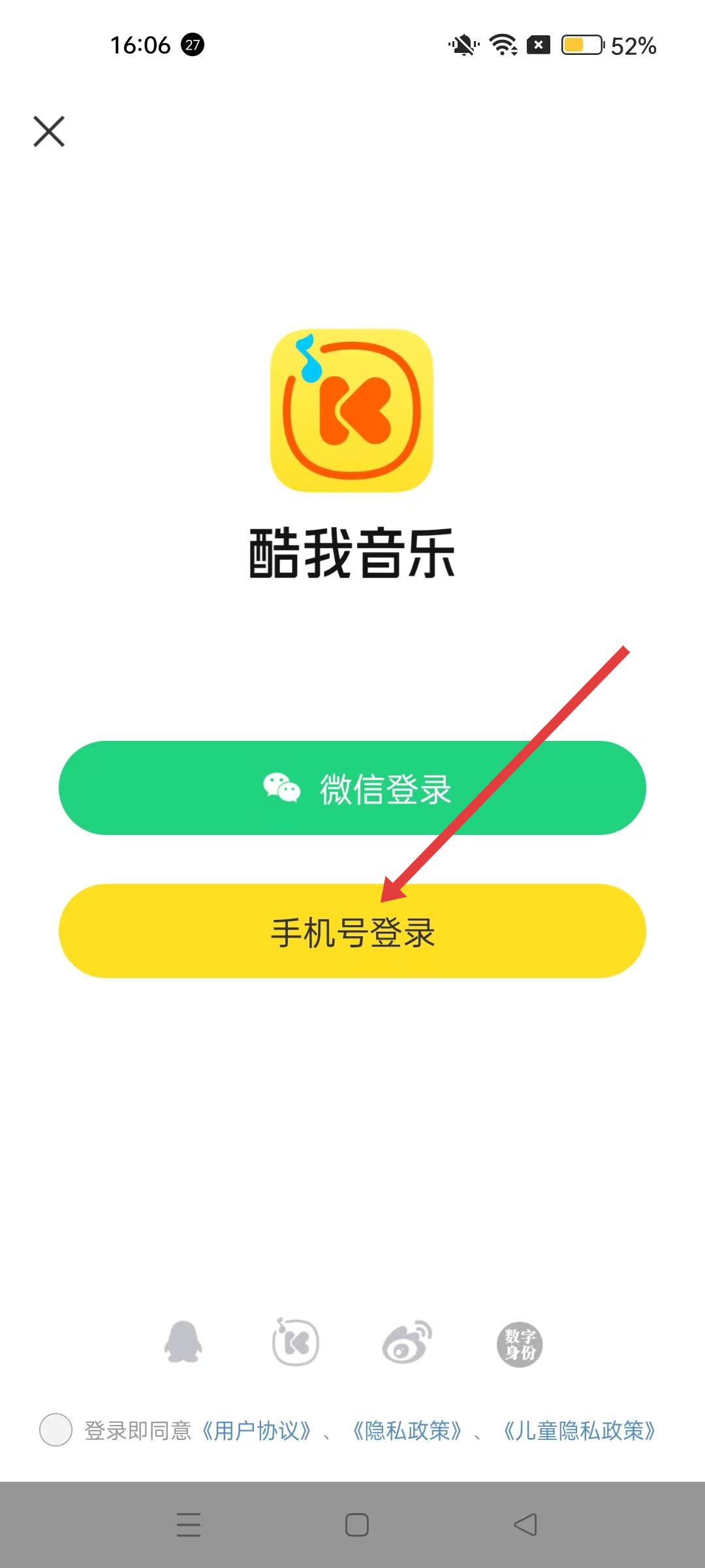 1、打開(kāi)酷我音樂(lè)登錄界面,界面展示有微信登錄和手機(jī)號(hào)登錄選項(xiàng),點(diǎn)擊手機(jī)號(hào)登錄,進(jìn)入請(qǐng)?jiān)O(shè)置登錄密碼頁(yè)面。
