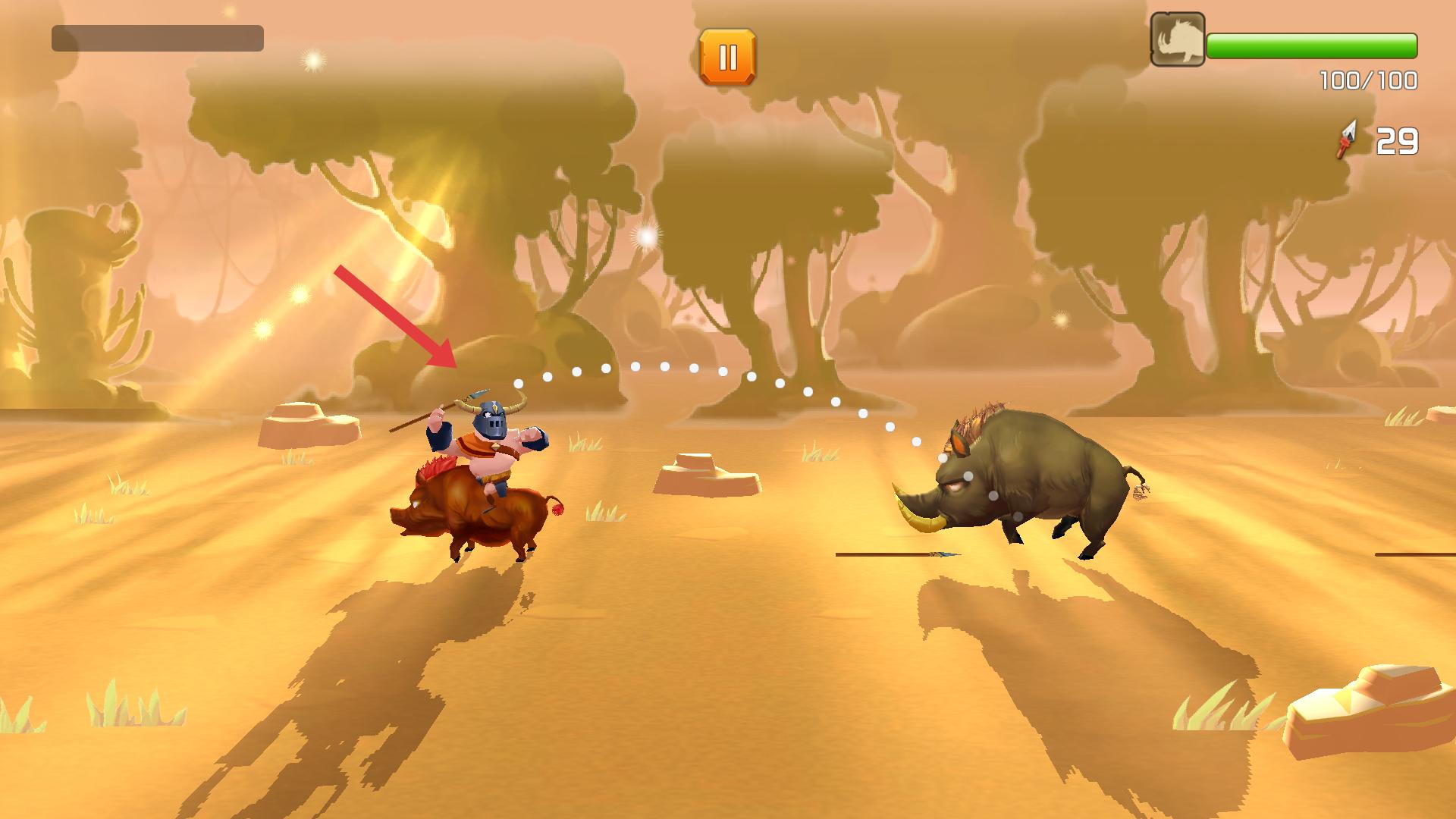 2、戰(zhàn)斗時(shí)操控角色騎乘野豬,瞄準(zhǔn)敵方野豬,按軌跡投擲武器,把握攻擊節(jié)奏,躲避敵方攻擊,持續(xù)輸出。