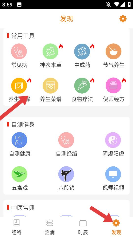 3、切換到發(fā)現(xiàn)板塊,有常見病,神農(nóng)本草等常用工具,還有自測(cè)健康,五禽戲等自測(cè)健身相關(guān)功能,可按需使用。